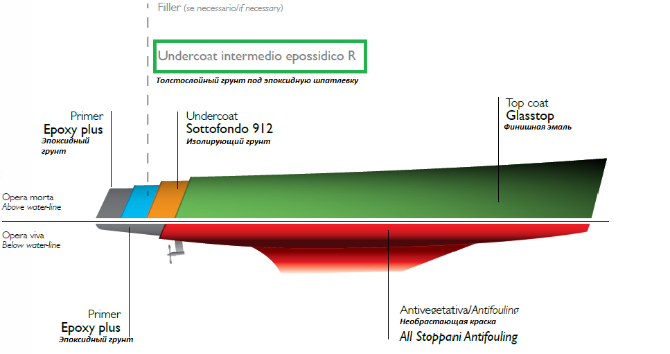 Грунтовка INTERMEDIO EPOSSIDICO R — двухкомпонентная эпоксидная грунтовка для любых поверхностей. Используется как промежуточный слой при окраске поверхностей корпуса судна, расположенных выше ватерлинии. Наносится под эпоксидную шпатлевку с целью ее уплотнения.